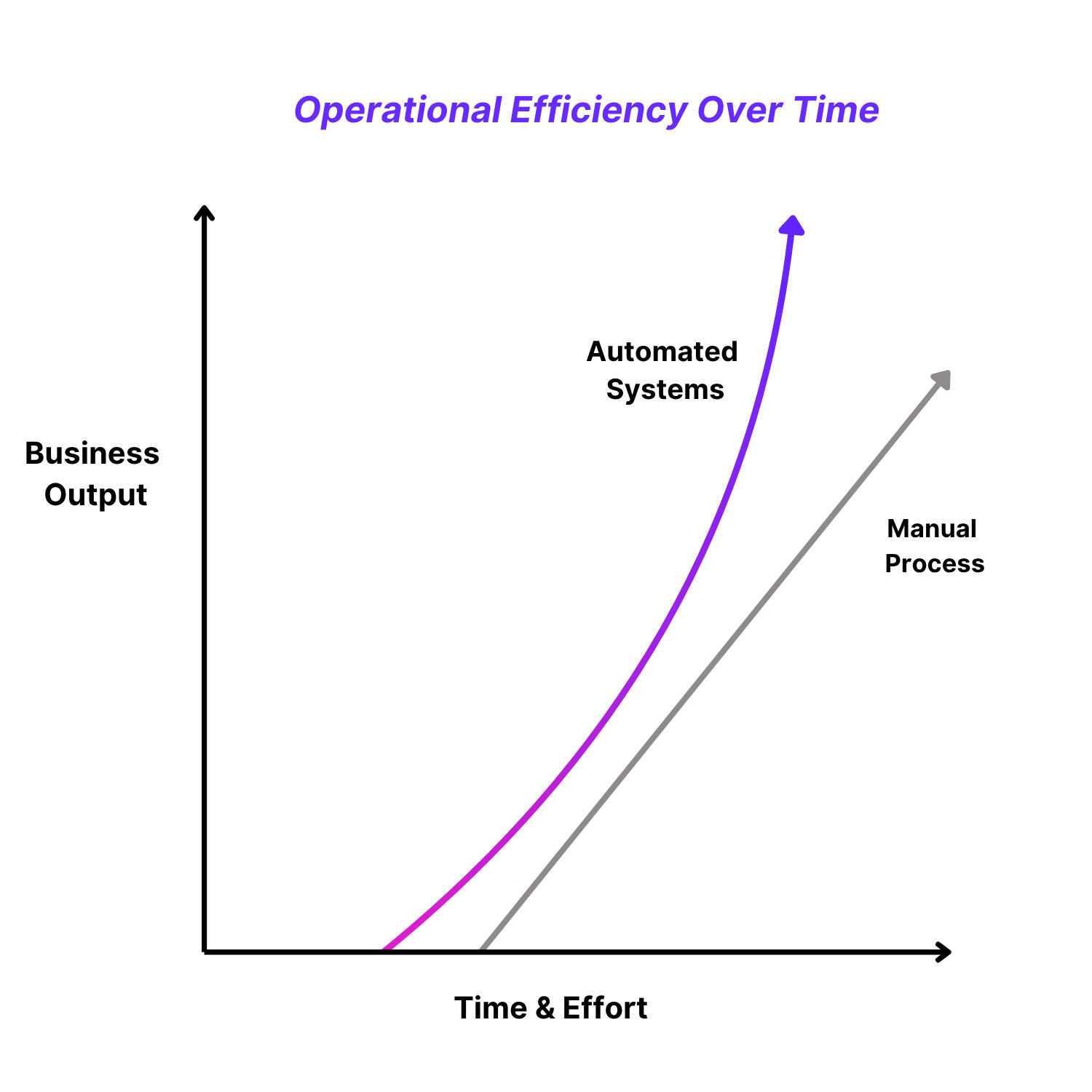 By replacing manual work with automation, you get faster growth with less effort. Our systems help you scale output efficiently. While manual processes grow linearly, automated systems create compounding gains across lead gen, onboarding, and internal ops.